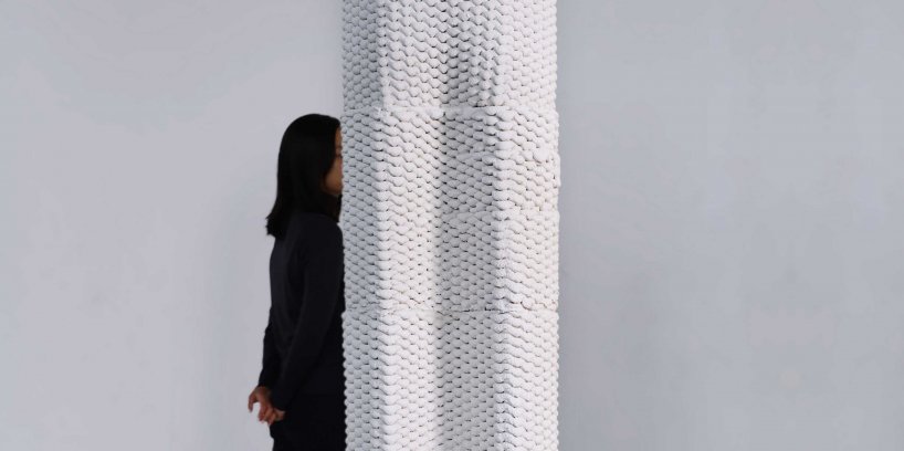 A prototype from the project is a monolithic corner column two metres high and made of four 3D-printed segments. The four individual parts are stuck together with mortar and then sprayed with a white cement-free render. The individual parts are easy to lift manually and stack on top of one another.