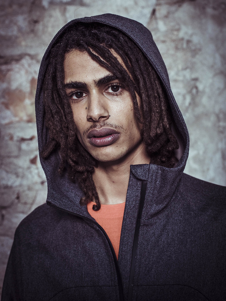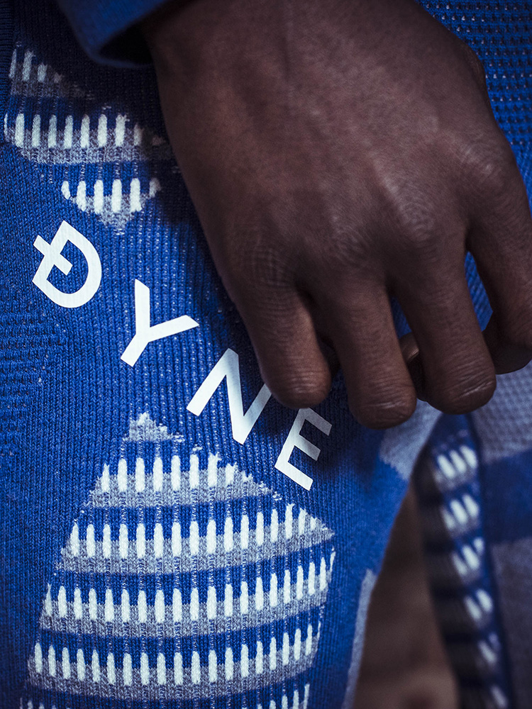 Inspired by learning to snowboard in the 1980s – in a wool bomber jacket – the collection of Dyne’s Christopher Bevans comprised a technical snowboarding wardrobe, complete with an NFC chip in the water-resistant wool jacket to track users in avalanches and ultimately bridge the gap between the brand and the consumer. Dyne describes itself as liminal, its garments designed to operate on both sides of every threshold, and to break the existing barriers of fabric, fit and function.