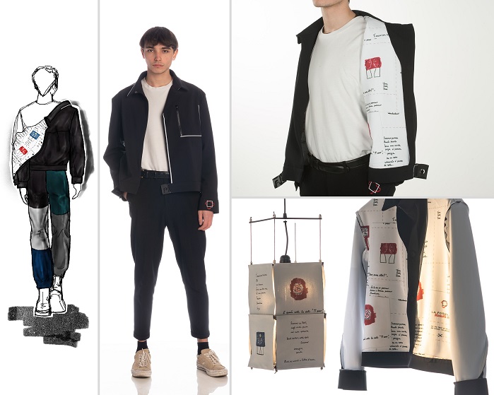 Letters, symbols and recollections of a love story in wartime. Innermost feelings and appearance with the roles and codes of a uniform, which does not always express the wearer. From this dichotomy, between “how I dress” and “what I am”, springs the jacket designed by Isabella Giambitto, internally embellished by fragments of letters from the front. Made from Sensitive Fabrics with heat welded seams, the jacket transforms into a lampshade for an internal lighting fixture.