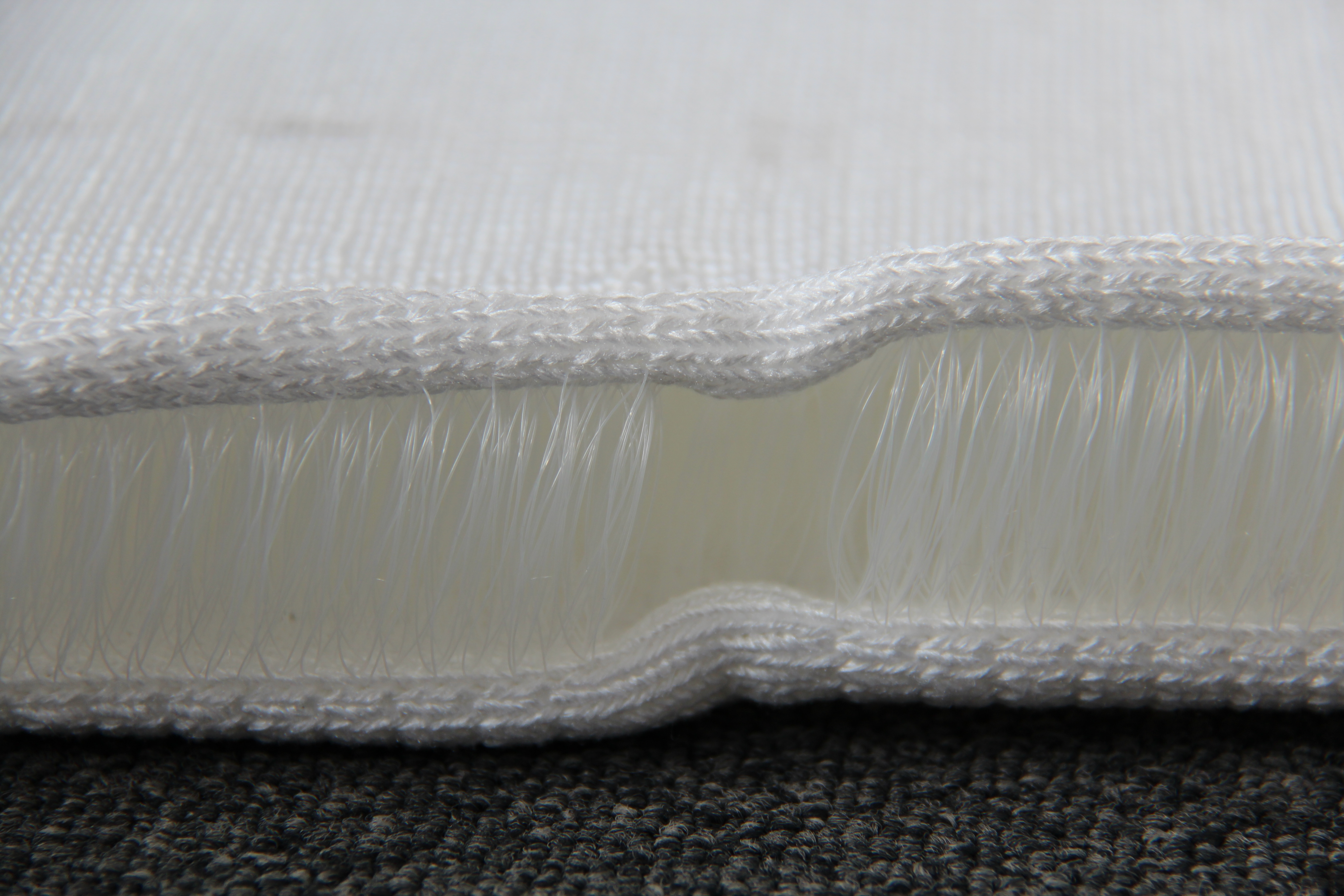 The spacer fabrics are produced on Karl Mayer’s HighDistance machine, the HD 6 / 20-65 EL double-bar raschel machine which can produce warp-knitted spacer fabrics up to 60 mm thick. Both the surfaces and the spacer layer can be produced in a wide range of designs and the possibility of being able to incorporate pile-free tunnel zones, folds and application specific contours into the 3D fabric also offers interesting design possibilities.