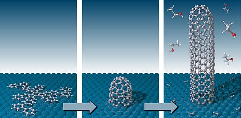 On a Platinum surface, the planar hydrocarbon precursor folds into an end cap, that in turn acts as seed for the growth of a well-defined carbon nanotube. (Source: Empa / Juan Ramon Sanchez Valencia)