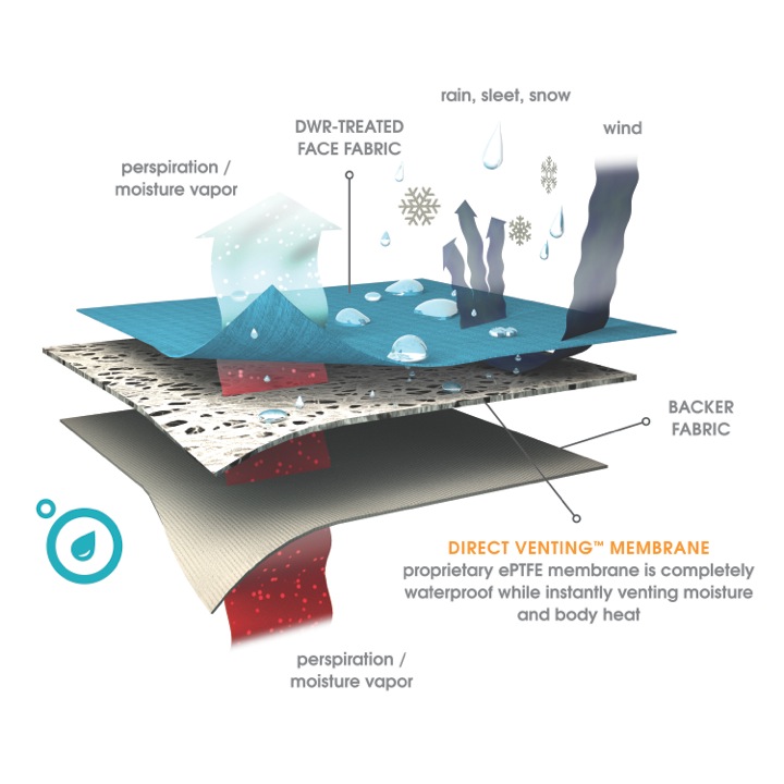 Direct Venting (DV) technology is said to be unique because it is air permeable, with millions of open pores that allow body heat and moisture to pass through the membrane nearly instantly, preventing the clammy feeling often felt inside waterproof apparel.